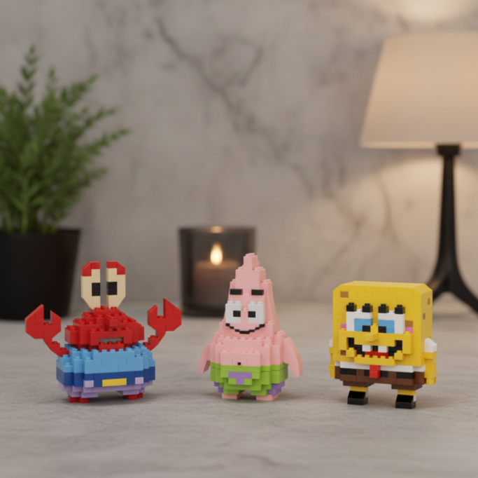 Wprowadź klimat podwodnej przygody do swojego pokoju dzięki wyjątkowym figurkom inspirowanym bohaterami z Bikini Dolnego! Każda postać została zbudowana z klocków z dbałością o detale – jak kultowe spodnie SpongeBoba, różowy odcień Patryka czy marudny wyraz twarzy Skalmara. Idealnie prezentują się na biurku, półce lub wśród kolekcji geekowych gadżetów, dodając pomieszczeniu humoru i morskiego charakteru.